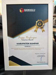 Inilahkampar-PEKANBARU – Bawaslu Kampar-Bawaslu Kabupaten Kampar meraih peringkat terbaik Pertama dalam pengelolaan Jaringan Dokumentasi dan Informasi Hukum (JDIH) Se-Provinsi Riau Tahun 2024, Penghargaan tersebut diberikan oleh Anggota Bawaslu Republik Indonesia, Totok Hariyono, Rabu (23/4/2025) di Aula Bawaslu Riau.