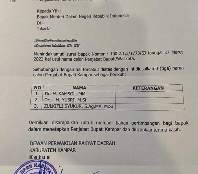 BANGKINANG – DPRD Kabupaten Kampar usulkan 3 nama calon Penjabat Bupati Kampar ke Kementerian Dalam Negeri (Kemendagri) RI. Usulan ini disampaikan DPRD Kampar melalui sebuah surat....